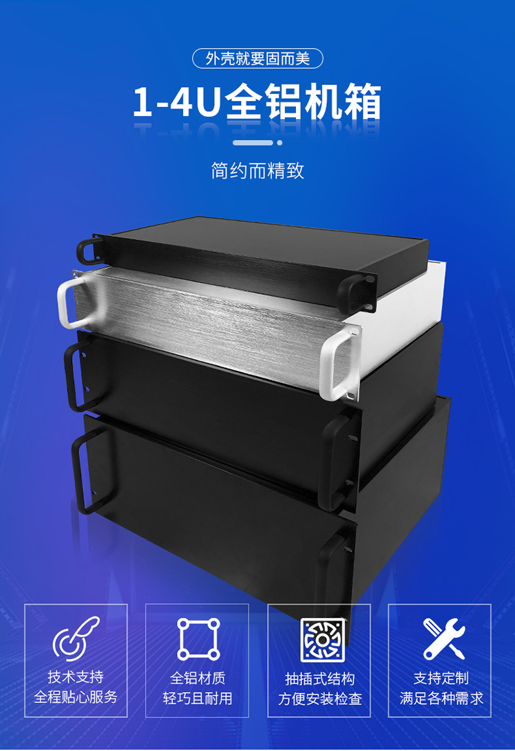 選擇一款適合自己的工控機箱至關(guān)重要,固而美制作的這款全鋁的工控機箱,性價比極高,不僅涵蓋了 1U,2U ,3U ,4U 各類的標準尺寸,還提供了各種常規(guī)的深度來供大家選擇,例如1U300深,2U300深,2U350深,4U350深,等比較常規(guī)的尺寸。就算是沒有找到合適自己的機箱也沒關(guān)系,可以根據(jù)需求單獨定制。在U型機箱中幾U指的是機箱的寬度,也可以理解為是機箱的厚度,1U=4.45CM,以次類推就可以計算出對應(yīng)幾U的尺寸。